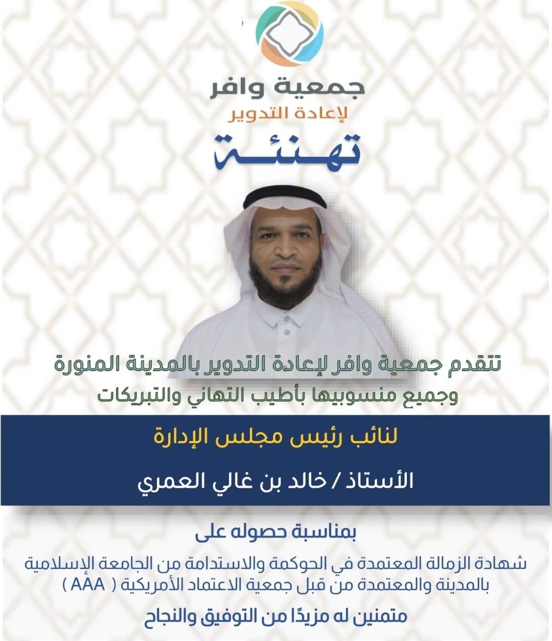 تتقدم جمعية وافر لإعادة التدوير بالمدينة المنورة ومنسوبيها بأطيب التهاني والتبريكات ، لنائب رئيس مجلس الادارة أ.خالد غالي العمري ، بمناسبة حصولة على شهادة الزماله ...