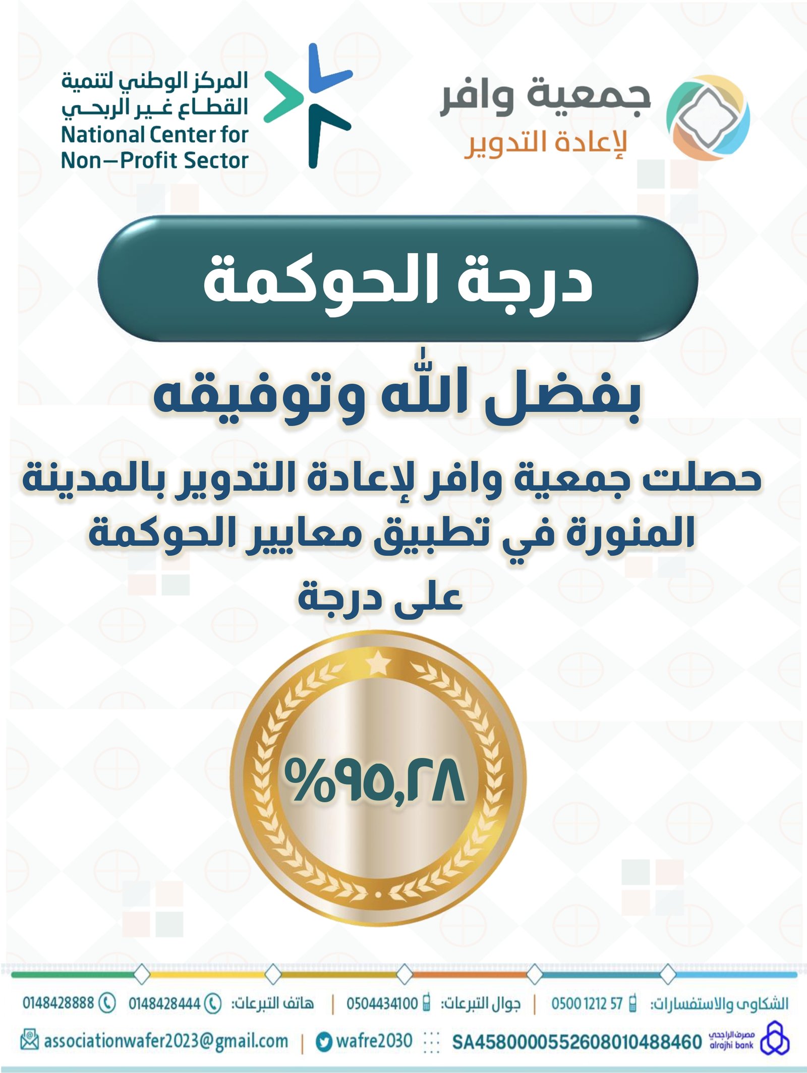 بحمد الله وتوفيقه، حصلت جمعية وافر لإعادة التدوير على درجة (95.28%) في تطبيق معايير الحوكمة الصادرة عن المركز الوطني لتنمية القطاع غير الربحي. ويعكس هذا الإنجاز حرص الج...